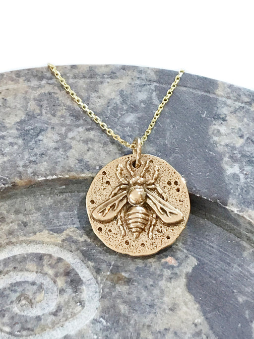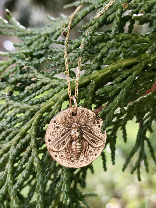 Original price $ 30.00 - Original price $ 30.00Original price$ 30.00$ 30.00 - $ 30.00Current price $ 30.00| /This necklace features a detailed raised honey bee embossed on a textured bronze medallion pendant. Pendant is 3/4" long. Comes on an 18" gold ver...