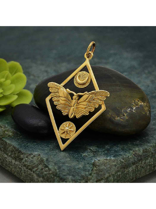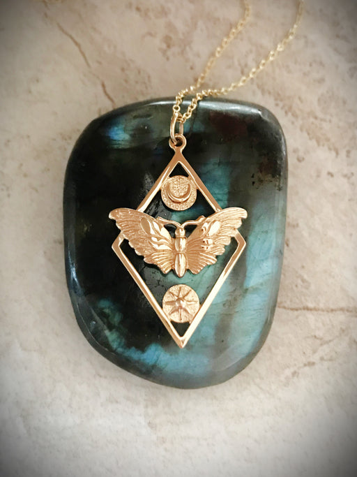 Original price $ 28.00 - Original price $ 28.00Original price$ 28.00$ 28.00 - $ 28.00Current price $ 28.00| /This necklace features a pendant of a detailed moth in a diamond-shaped frame with an embossed crescent moon above and sun below. Bronze pendant o...