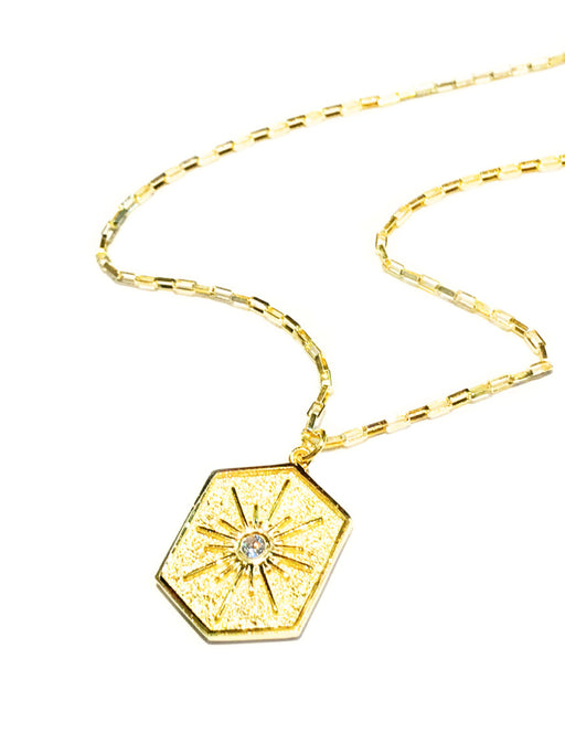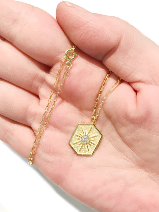 Original price $ 28.00 - Original price $ 28.00Original price$ 28.00$ 28.00 - $ 28.00Current price $ 28.00| /This celestial necklace features a hexagonal medallion with a twinkling star set with a large CZ crystal against a textured matte background. Penda...