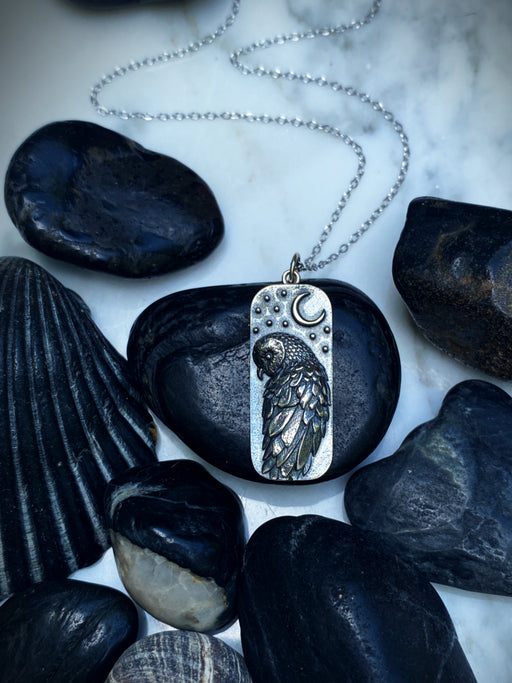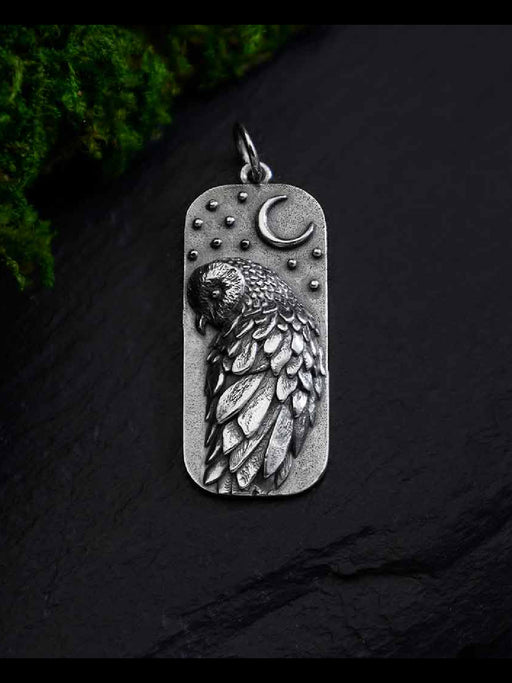 Original price $ 62.00 - Original price $ 62.00Original price$ 62.00$ 62.00 - $ 62.00Current price $ 62.00| /This necklace features a long tablet of silver embossed with a mystical nighttime scene of a crescent moon and starry sky, with a barn owl in profi...