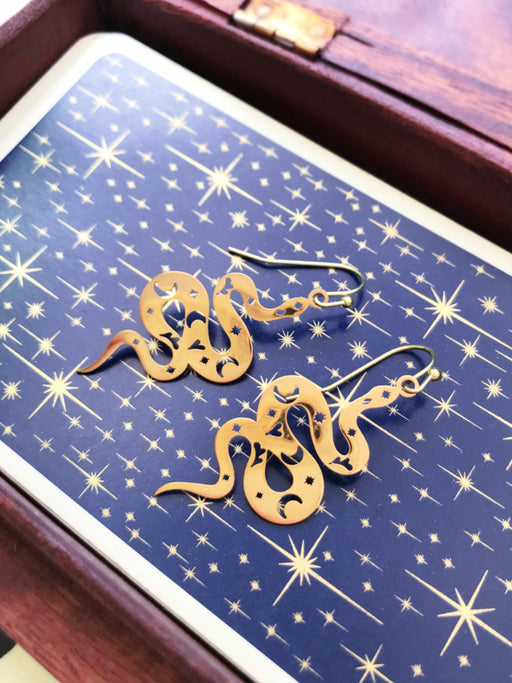 Original price $ 16.00 - Original price $ 16.00Original price$ 16.00$ 16.00 - $ 16.00Current price $ 16.00| /These bold statement earrings feature a dangle of a curled snake with shapes cutout including stars, crescent moons, leaves and hearts. Shiny gold ...