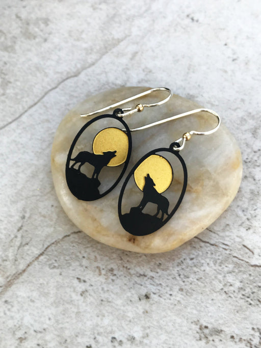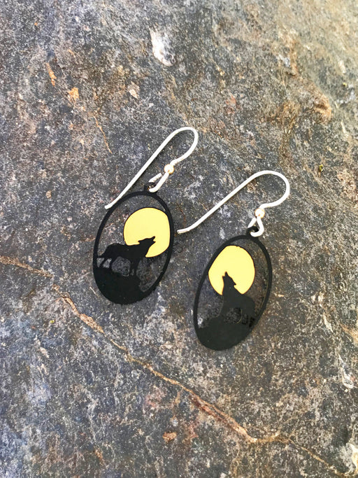 Original price $ 20.00 - Original price $ 20.00Original price$ 20.00$ 20.00 - $ 20.00Current price $ 20.00| /Show your wild nature with these howling wolf earrings! A black enamel oval shows a silhouette of a wolf howling against a golden full moon. Sterl...