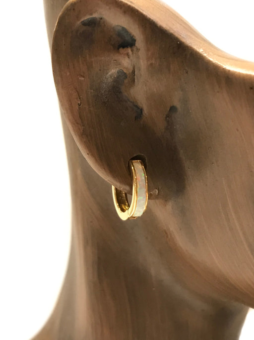 Original price $ 24.00 - Original price $ 24.00Original price$ 24.00$ 24.00 - $ 24.00Current price $ 24.00| /These super elegant huggie hoops are lined with small beads of white lab-created opal. Huggie hoops are hinged the bottom and click to clasp. Gold...