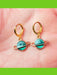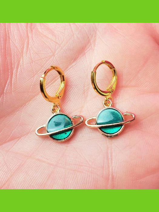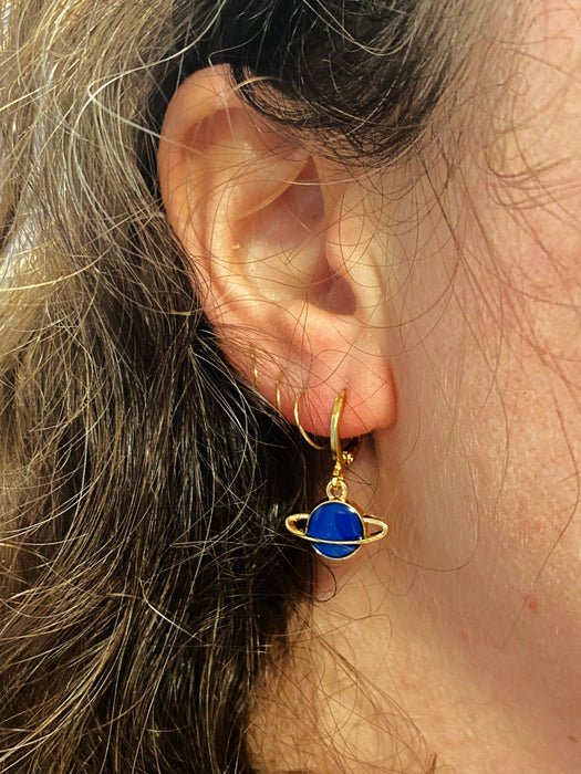 These celestial earrings feature a gold lever-back huggie hoop with a charm of the planet Saturn in translucent blue enamel. Made by Alien Bratz, a pop-culture and nostalgia inspired line based out of Philadelphia.