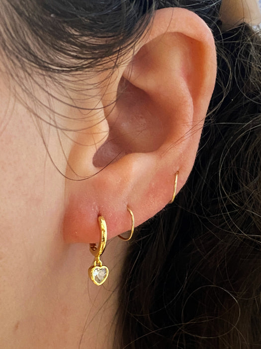 These adorable huggie hoops have a charm of a cut crystal heart bezel set in gold. Huggie hoops are hinged at the bottom and click to clasp.