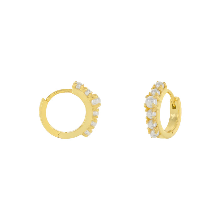 These chic petite huggie hoops are studded with tiny pearls with one larger one in the center. Huggie hoops are hinged at the bottom and click to clasp.