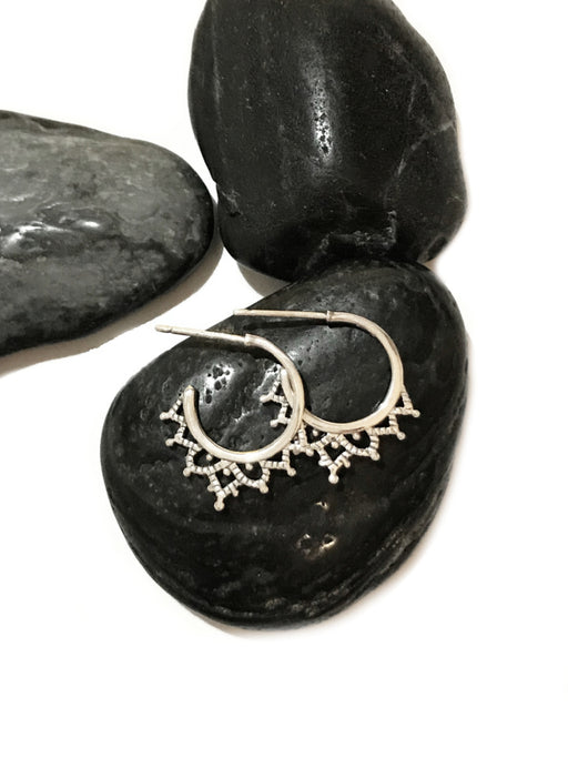 Original price $ 24.00 - Original price $ 24.00Original price$ 24.00$ 24.00 - $ 24.00Current price $ 24.00| /These stud hoop earrings have a border of beautiful filigree petals. Sterling silver. Just over 1/2" long. Made by boma.