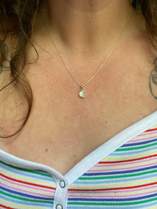 Original price $ 32.00 - Original price $ 32.00Original price$ 32.00$ 32.00 - $ 32.00Current price $ 32.00| /This necklace features a pendant of a crescent moon inlaid with labradorite or rainbow moonstone. Sterling silver pendant and chain. Comes on an a...
