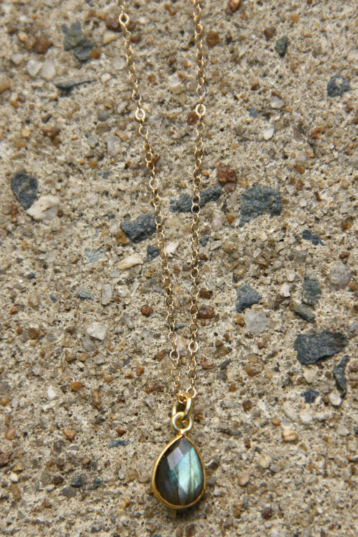 Original price $ 38.00 - Original price $ 38.00Original price$ 38.00$ 38.00 - $ 38.00Current price $ 38.00| /This gemstone necklace has a gold encased teardrop of faceted labradorite for earthy iridescence. 14kt gold filled chain. Pendant is approx. 3/4" ...