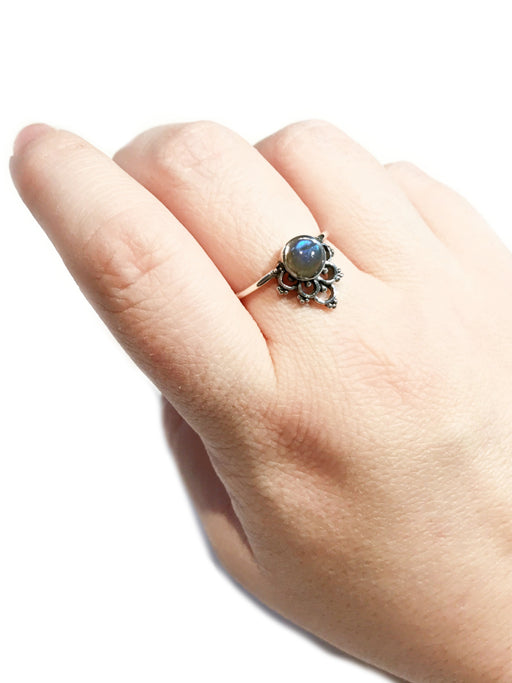 Original price $ 25.00 - Original price $ 25.00Original price$ 25.00$ 25.00 - $ 25.00Current price $ 25.00| /This elegant handmade ring has an oval labradorite stone flanked by two small round labradorite stones and set in a toothed crown style setting. La...