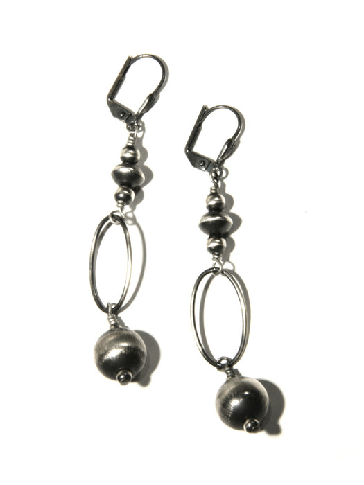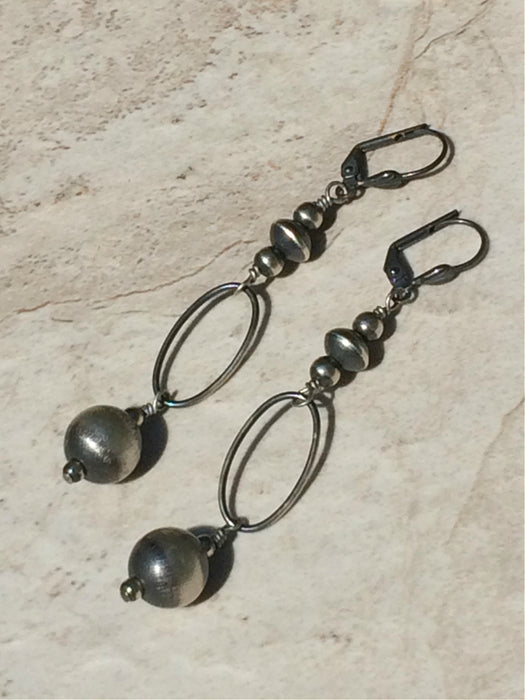Navajo pearls are actually handmade spheres of silver, each one crafted individually with care in the American Southwest by Navajo artists that have been making these pieces for generations. These statement earrings feature an assortment of pearls, with an open oval ring leading to a large pearl at the bottom. This piece is a remarkable representation of the cultural history of jewelry-making by indigenous cultures, which we are honored to share with our customers.