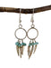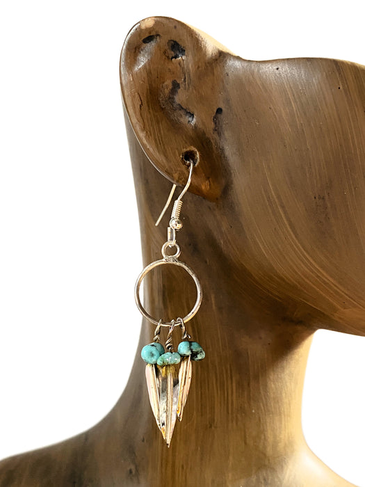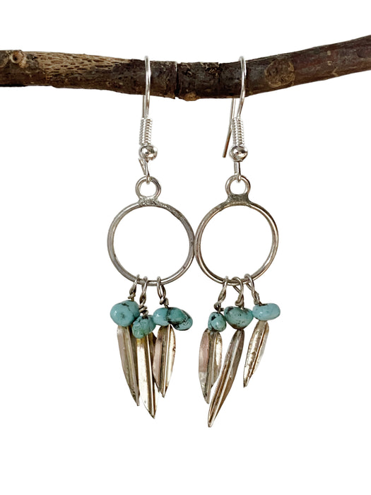 These handmade earrings are a ring of silver with three turquoise nuggets and silver feather fringe dangles. Each feather is handmade, and represents a connection to the spirit world in Native American culture. These are handcrafted in the Southwest by Navajo artisans, and is a remarkable representation of the cultural history of jewelry-making by indigenous cultures, which we are honored to share with our customers.