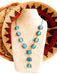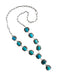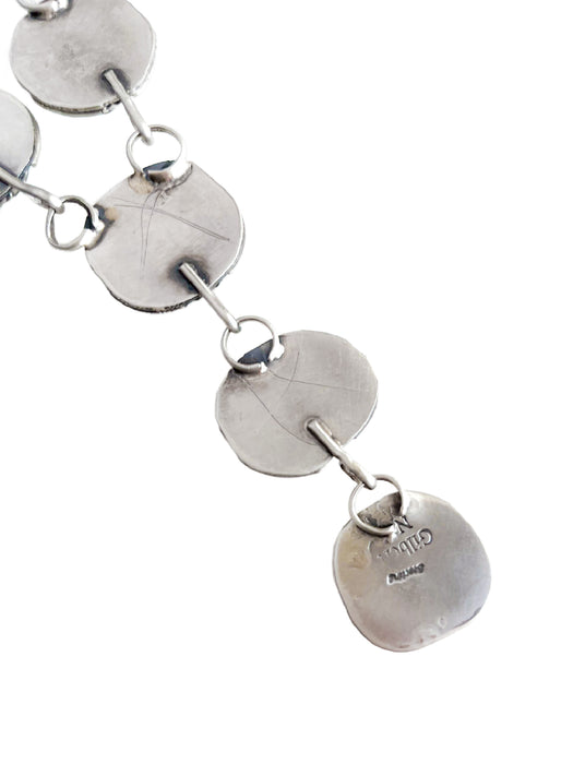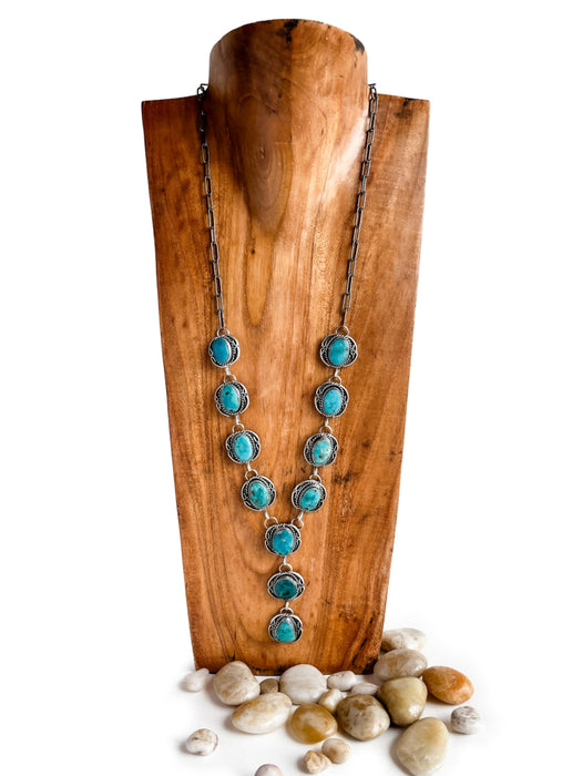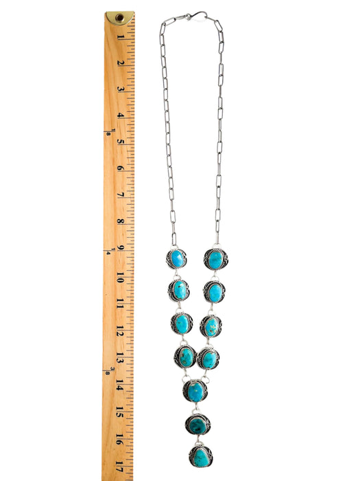 This high-end statement necklace is a true collector's piece, handmade in the American Southwest by award-winning Navajo artist Gilbert Nelson. This piece is hallmarked by the artist and features genuine bright blue Kingman turquoise. A row of eight set oval cabochons lead to a centerpiece of a large drop of three stones. Each piece has classic silverwork rope braid & loop detail. This piece is a remarkable representation of the cultural history of jewelry-making by indigenous cultures, which we are honored to share with our customers.