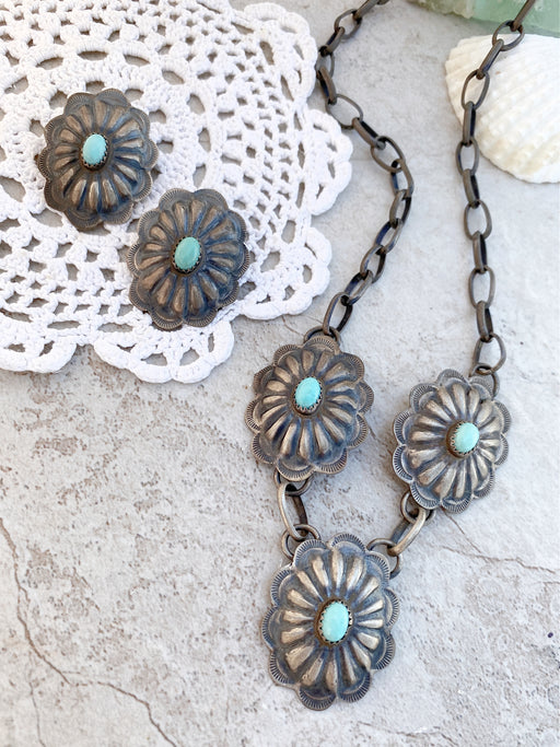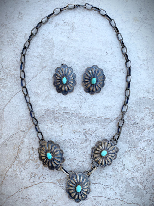 Original price $ 138.00 - Original price $ 138.00Original price$ 138.00$ 138.00 - $ 138.00Current price $ 138.00| /This fabulous statement set is Navajo made and features a traditional Concho design, meaning "shell", a scalloped medallion of thin silver and set ...