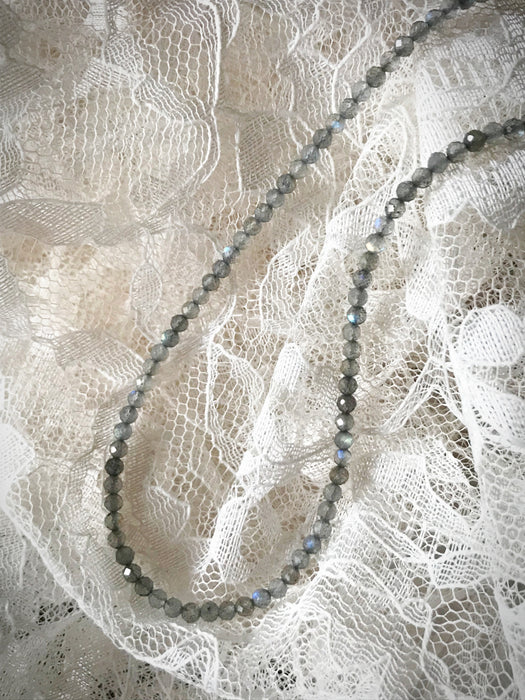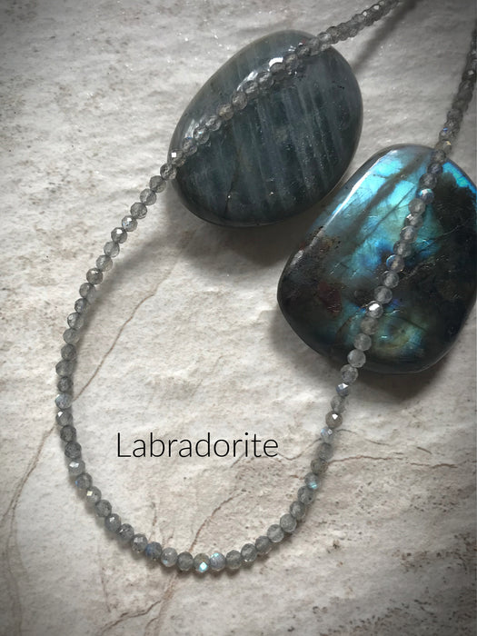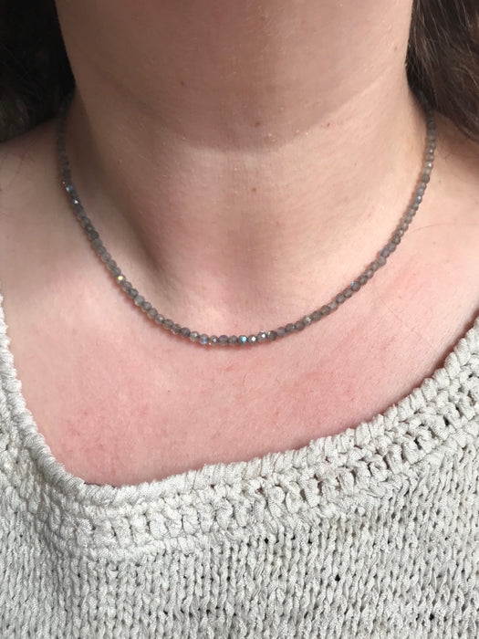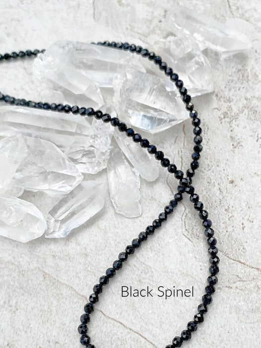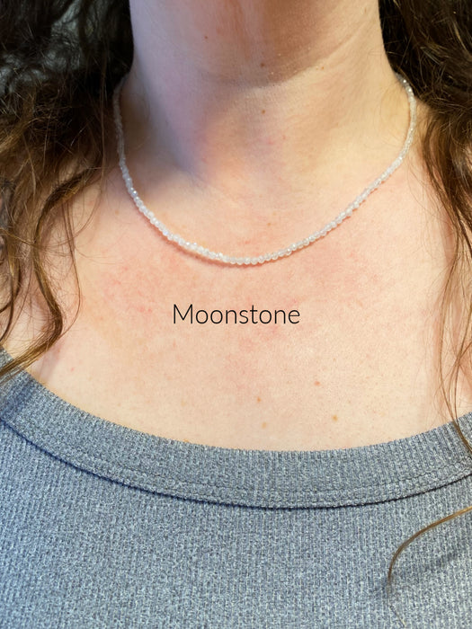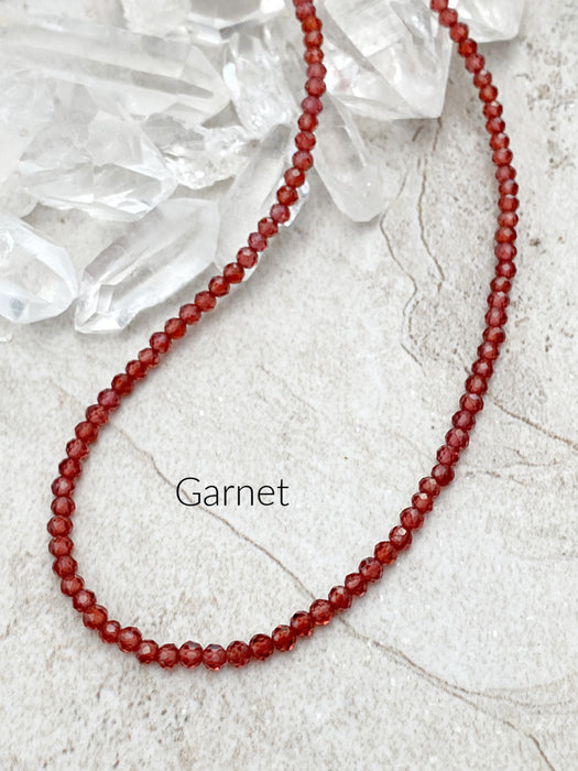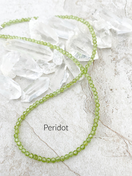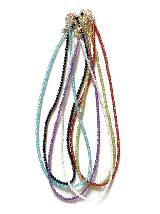 These versatile and elegant gemstone necklaces feature small 3mm faceted beads. Wear by itself or slide on a pendant!