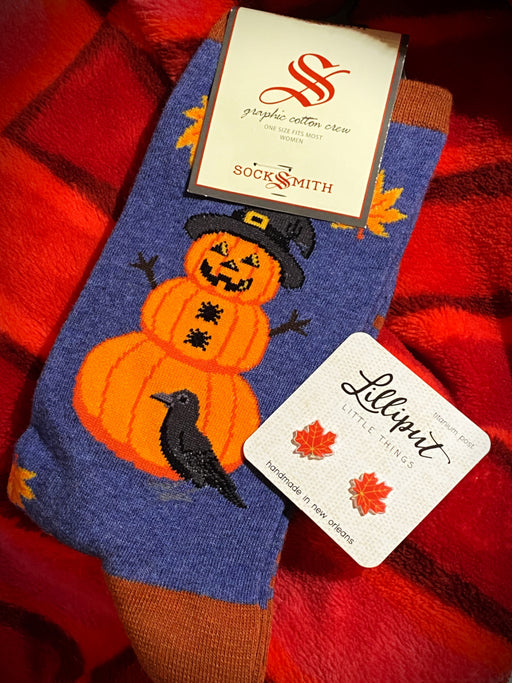 Original price $ 9.95 - Original price $ 9.95Original price$ 9.95$ 9.95 - $ 9.95Current price $ 9.95| /These crew socks have an autumnal print of a "pumpkinman" with Pilgrim's hat and crow friend surrounded by orange maple leaves on a denim heather b...