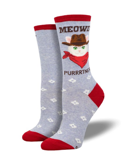 This is what every single cat in the south looks like. Trust me, we're from here. A spunky cowboy cat with hat and bandana with "Meowdy Purrtner" against a gray background with red details.