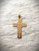 This large gold filled cross is engraved with a fine crosshatch design and bordered with a geometric cutout border.