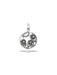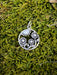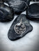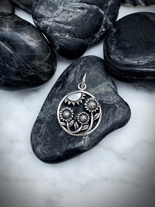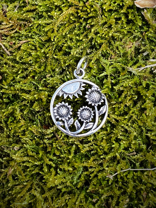 This pendant is a circle with three blooming sunflowers under a radiant sun with oxidized details.