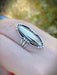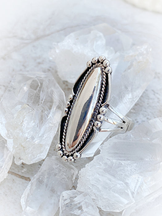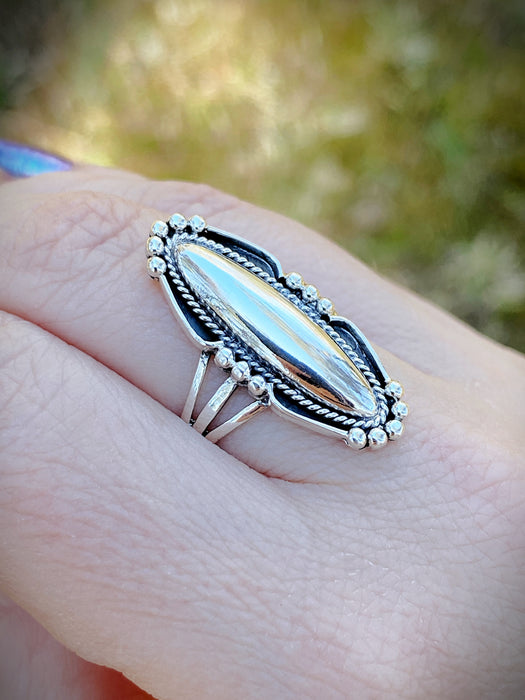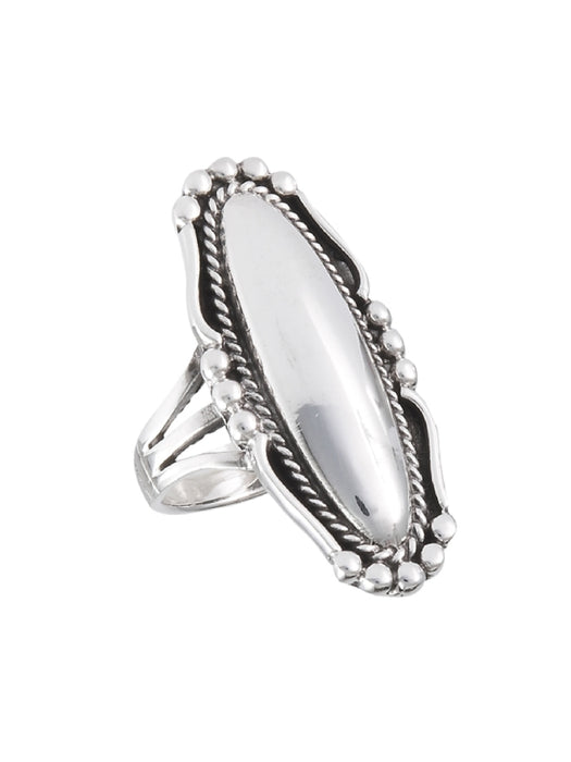 This sterling silver statement ring features a highly polished oval framed by rope & bead silver work.