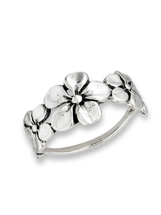 This gorgeous ring features a row of three sweet five-petaled blossoms with a small leaf detail on each side.