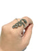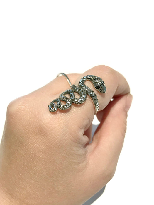 This powerful statement ring is a winding snake with realistic oxidized silver detail and black crystal eyes.