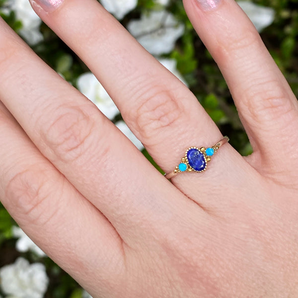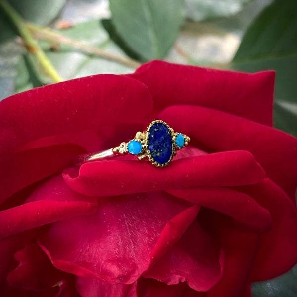 Original price $ 30.00 - Original price $ 30.00Original price$ 30.00$ 30.00 - $ 30.00Current price $ 30.00| /This ring features a polished oval of navy-blue lapis set with a bright blue turquoise gem on each side. The stones are set in brass with a silver ...