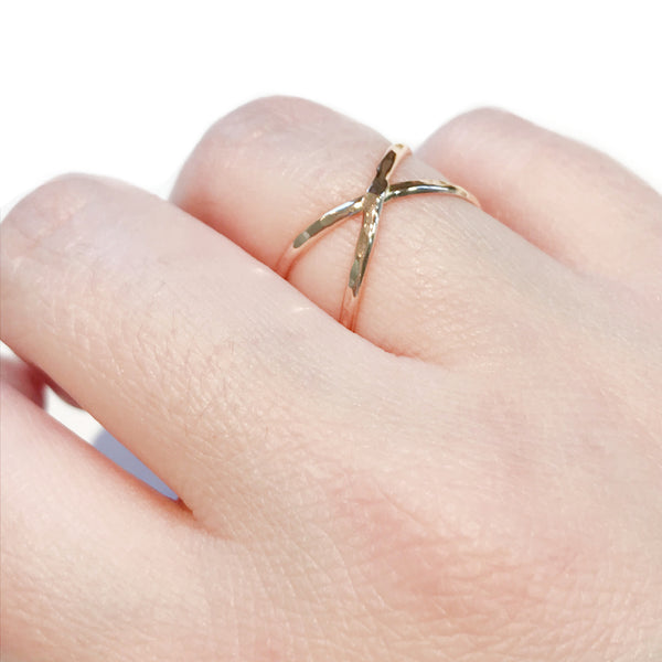 Original price $ 22.00 - Original price $ 22.00Original price$ 22.00$ 22.00 - $ 22.00Current price $ 22.00| /This trendy geometric ring has two hammered bands crossing in an X-shape. Available in whole sizes 6-11. 14kt gold filled. Handmade in the USA! Ri...