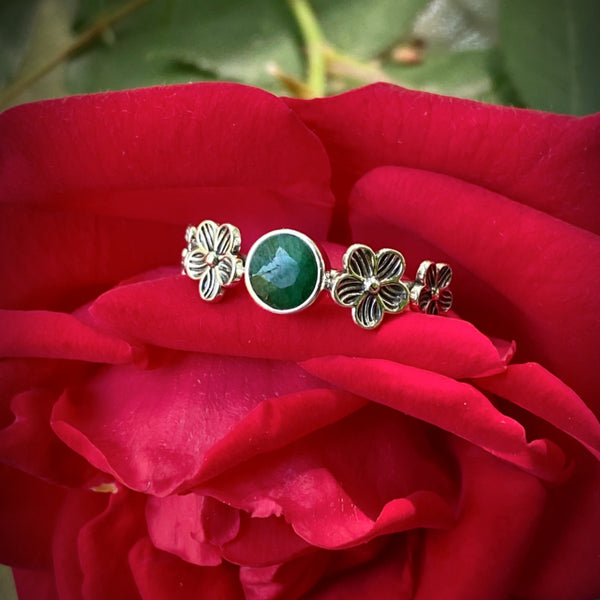 Original price $ 28.00 - Original price $ 28.00Original price$ 28.00$ 28.00 - $ 28.00Current price $ 28.00| /This nature-inspired ring has a faceted green onyx gem in the center flanked with two silver flowers with oxidized detail. Available in whole size...