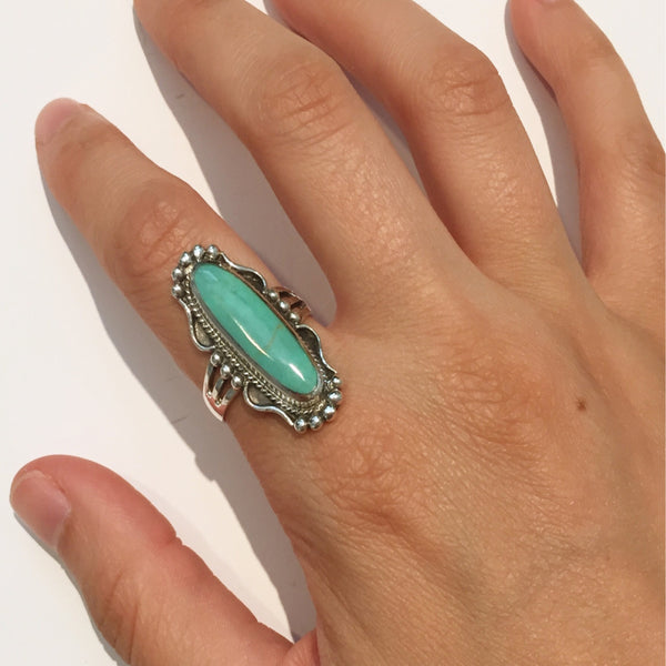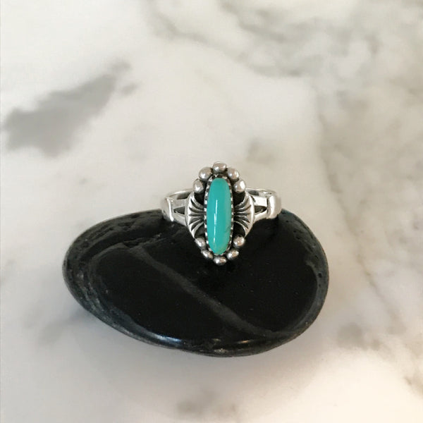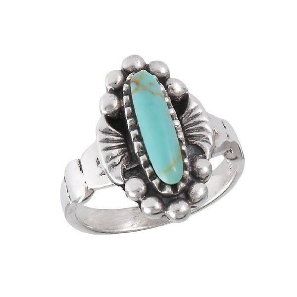 Original price $ 20.00 - Original price $ 20.00Original price$ 20.00$ 20.00 - $ 20.00Current price $ 20.00| /Southwest-style ring features an oval synthetic turquoise stone with a detailed silver border. Available in whole sizes 5-9. Sterling silver. Measu...