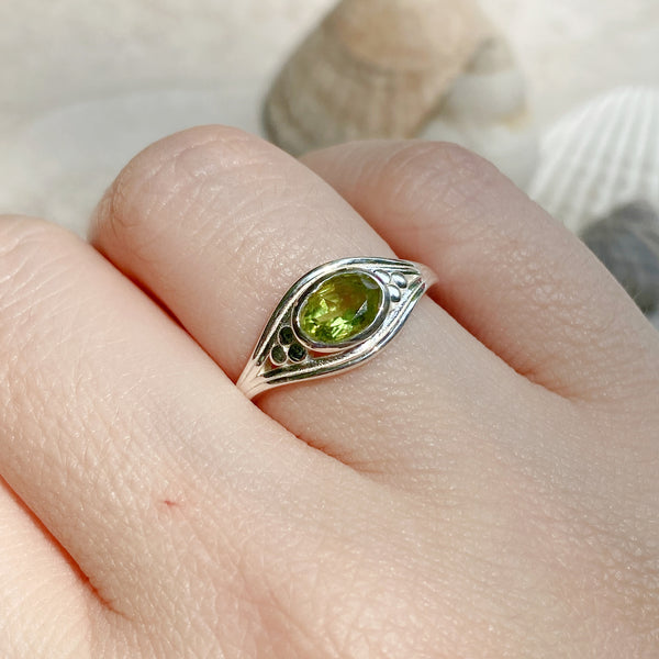 Original price $ 20.00 - Original price $ 20.00Original price$ 20.00$ 20.00 - $ 20.00Current price $ 20.00| /This petite ring has a small round peridot gemstone crown-set with three silver ball bead details on the top and bottom of the stone. Available in ...