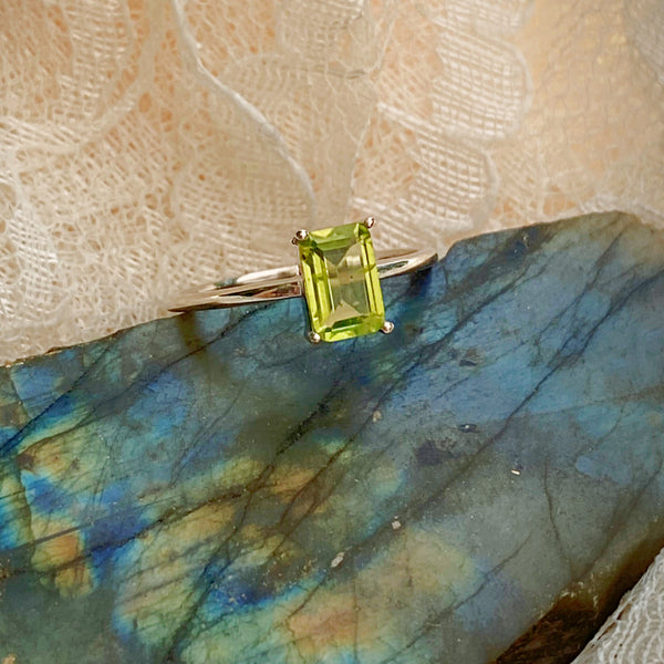 Original price $ 25.00 - Original price $ 25.00Original price$ 25.00$ 25.00 - $ 25.00Current price $ 25.00| /This elegant handmade ring has a labradorite baguette flanked by two small peridot gems and set in a toothed crown style setting. Labradorite is a ...