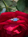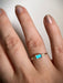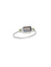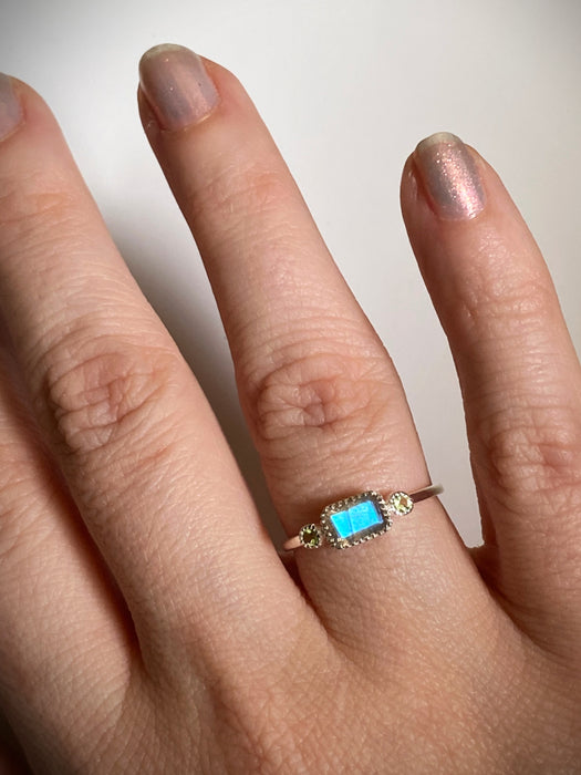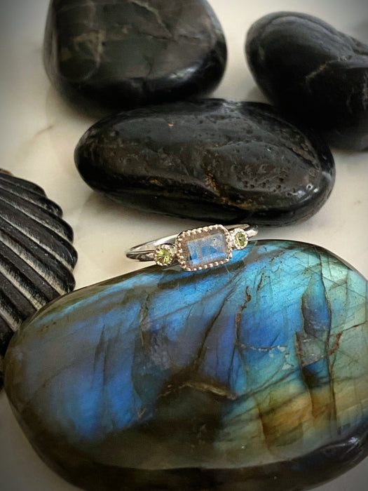 This elegant handmade ring has a labradorite baguette flanked by two small peridot gems and set in a toothed crown style setting. Labradorite is a grayish stone that has flashes of blue and green iridescence.