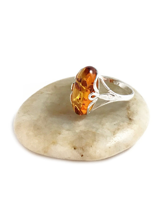 This ring features a long oval of cognac colored amber set in a sterling silver setting with silver loop detail on the shank of the ring. Genuine Baltic amber.