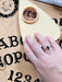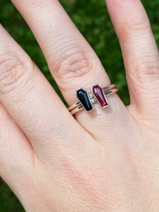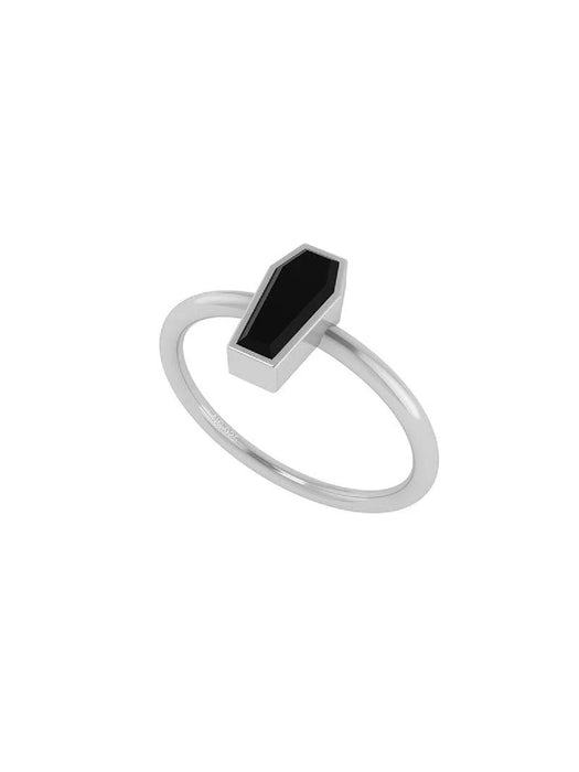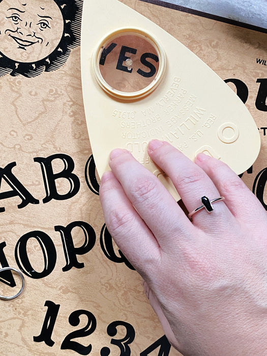 This mystical ring features a coffin-cut black tourmaline gemstone, encased in sterling silver and set on a simple band. Black tourmaline is said to protect the wearer from negativity and enhance feelings of power and strength, especially in the workplace.