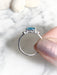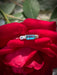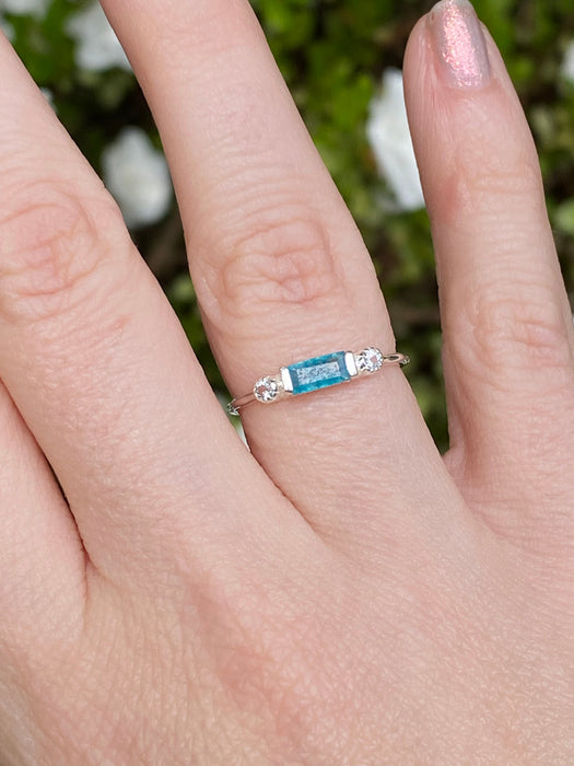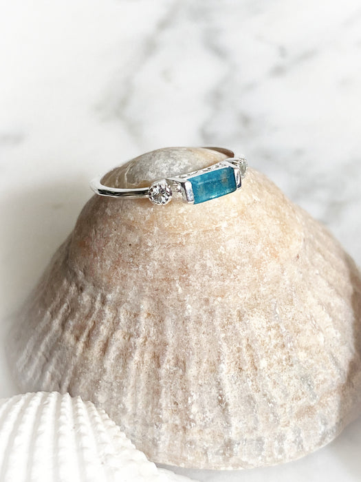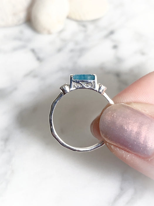 This elegant ring features a baguette bar of bright aqua blue neon apatite, flanked on each side by a small sparkly blue topaz. The raised setting features a cutout swirl design and a hammered band.