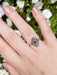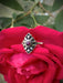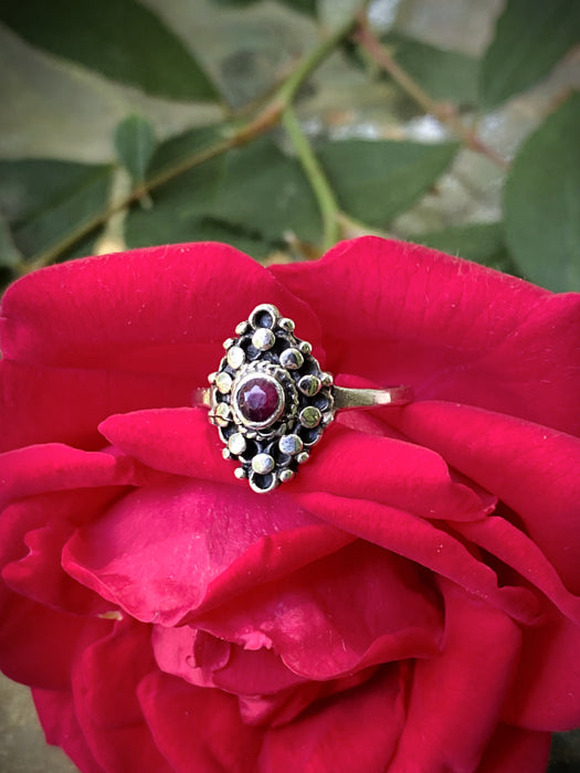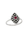 This ring features a diamond-shaped shield decorated with silver dot design and set in the middle with a small faceted ruby gemstone.