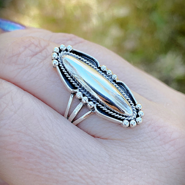 Original price $ 30.00 - Original price $ 30.00Original price$ 30.00$ 30.00 - $ 30.00Current price $ 30.00| /This sterling silver statement ring features a highly polished oval framed by rope & bead silver work. Sizes 7-10 available. 1" from top to bot...