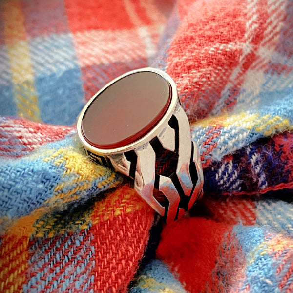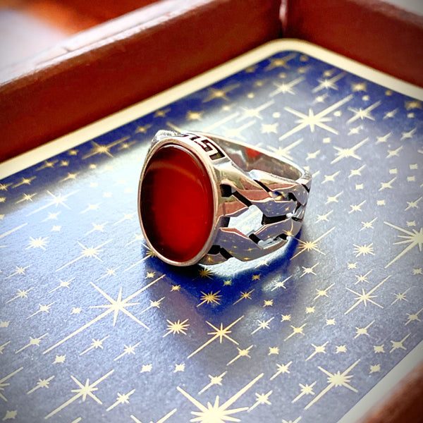 Original price $ 65.00 - Original price $ 65.00Original price$ 65.00$ 65.00 - $ 65.00Current price $ 65.00| /This sturdy signet-style ring features a braided knot band set in the center with a large polished red- orange carnelian agate cabochon. The top an...