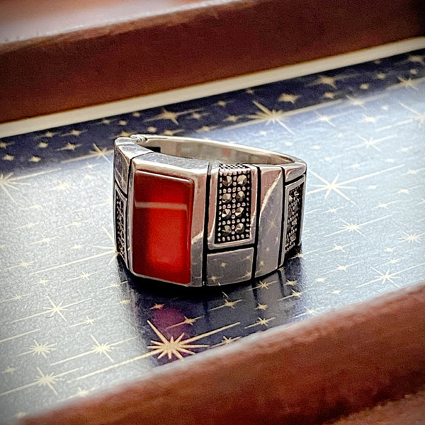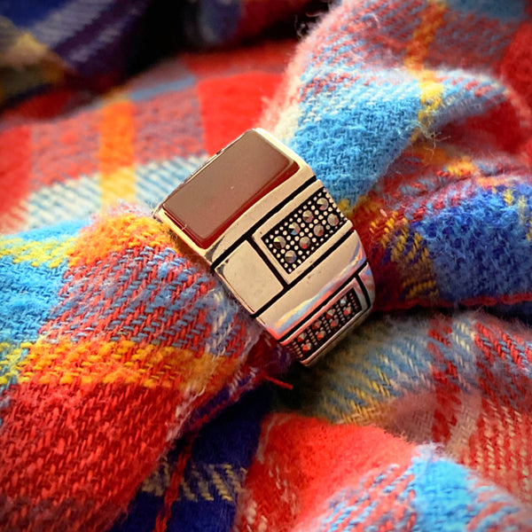 Original price $ 75.00 - Original price $ 75.00Original price$ 75.00$ 75.00 - $ 75.00Current price $ 75.00| /This sturdy signet-style ring is engraved with a geometric brick pattern and inlaid in the center with a bar of orange-red carnelian agate. The sid...
