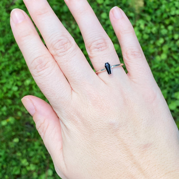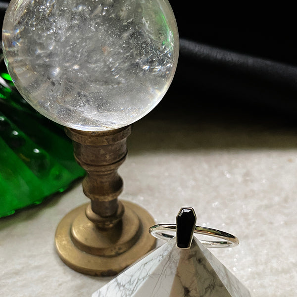 Original price $ 24.00 - Original price $ 24.00Original price$ 24.00$ 24.00 - $ 24.00Current price $ 24.00| /This mystical ring features a coffin-cut black tourmaline gemstone, encased in sterling silver and set on a simple band. Black tourmaline is said t...