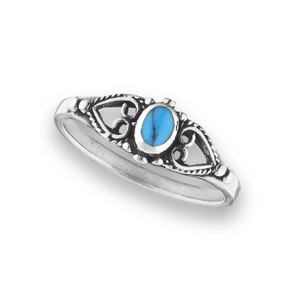 Original price $ 14.00 - Original price $ 14.00Original price$ 14.00$ 14.00 - $ 14.00Current price $ 14.00| /This sweet ring has an oval synthetic turquoise stone surrounded by stylized filigree hearts. Available in whole sizes 5-10. Sterling silver. Face...