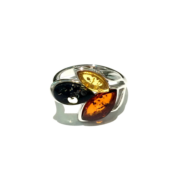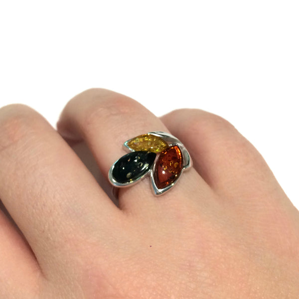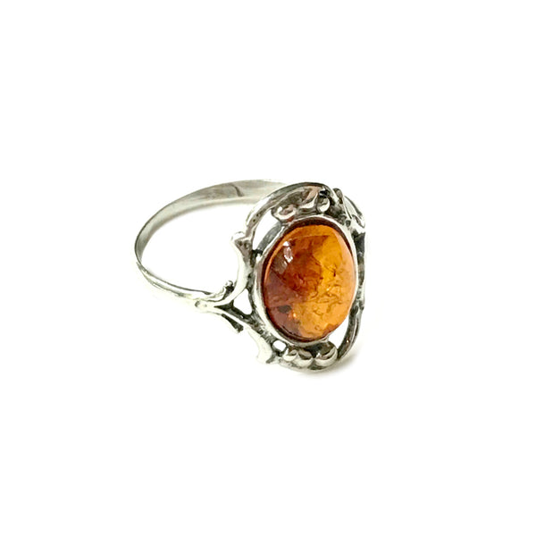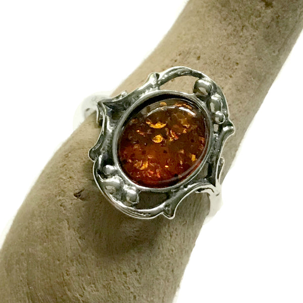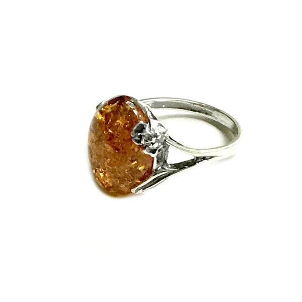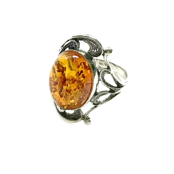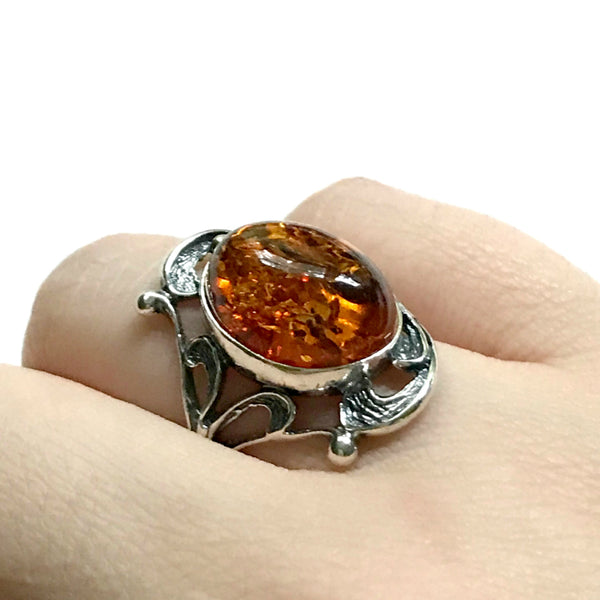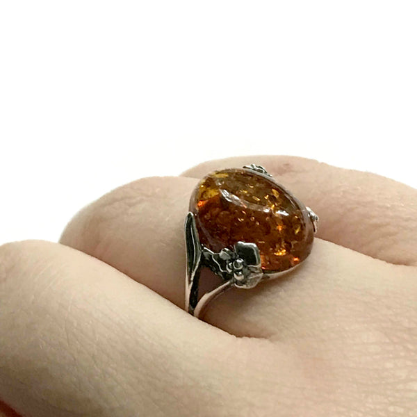 Original price $ 28.00 - Original price $ 28.00Original price$ 28.00$ 28.00 - $ 28.00Current price $ 28.00| /These stunning rings feature an oval cabochon of cognac colored amber, set with silver flowers and leaves branching up the sides, covering the spli...