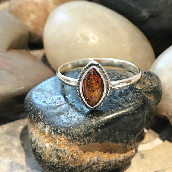 Original price $ 22.00 - Original price $ 22.00Original price$ 22.00$ 22.00 - $ 22.00Current price $ 22.00| /This ring features a long oval of cognac colored amber set in a sterling silver setting with silver loop detail on the shank of the ring. Genuine B...