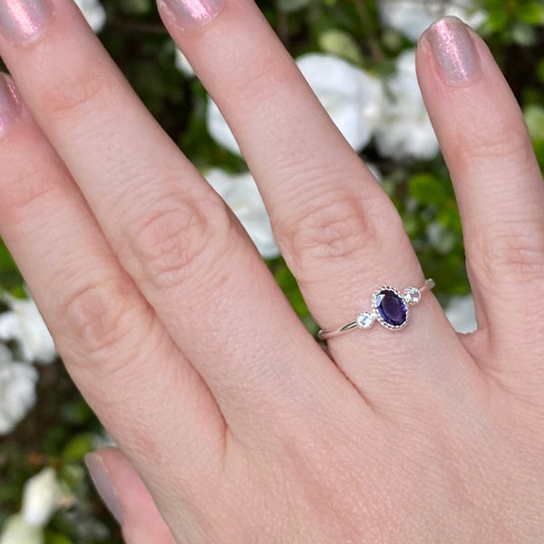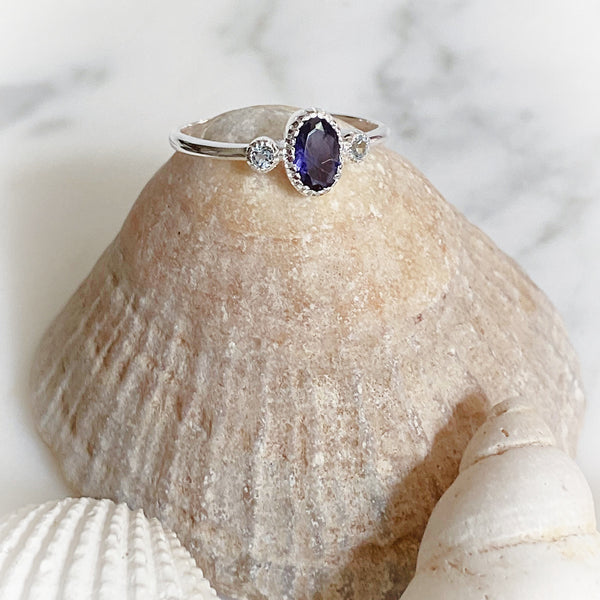 Original price $ 25.00 - Original price $ 25.00Original price$ 25.00$ 25.00 - $ 25.00Current price $ 25.00| /This elegant ring features an oval cut iolite gemstone set with a small round blue topaz gem on each side. Toothed edge detail adds extra decoratio...