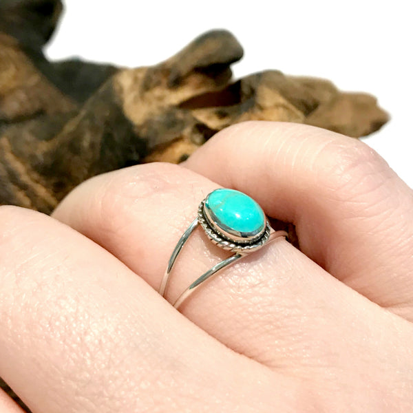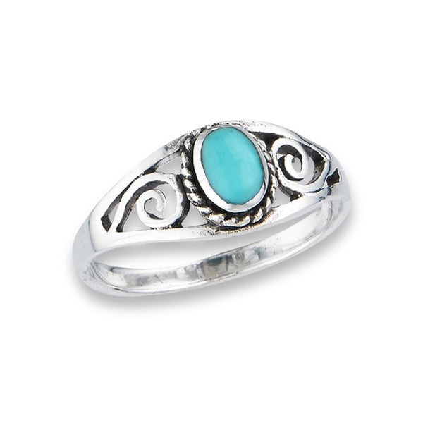 Original price $ 16.00 - Original price $ 16.00Original price$ 16.00$ 16.00 - $ 16.00Current price $ 16.00| /This elegant ring has an oval synthetic turquoise stone set in the center, surrounded by a delicate rope border and fanciful swirls. Available in w...