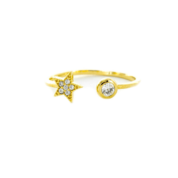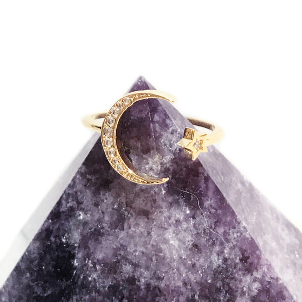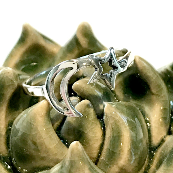 Original price $ 12.00 - Original price $ 12.00Original price$ 12.00$ 12.00 - $ 12.00Current price $ 12.00| /This celestial ring is a crescent moon encircling a star. The moon has oxidized silver detailed face. Sterling Silver. Available in whole sizes 4-...
