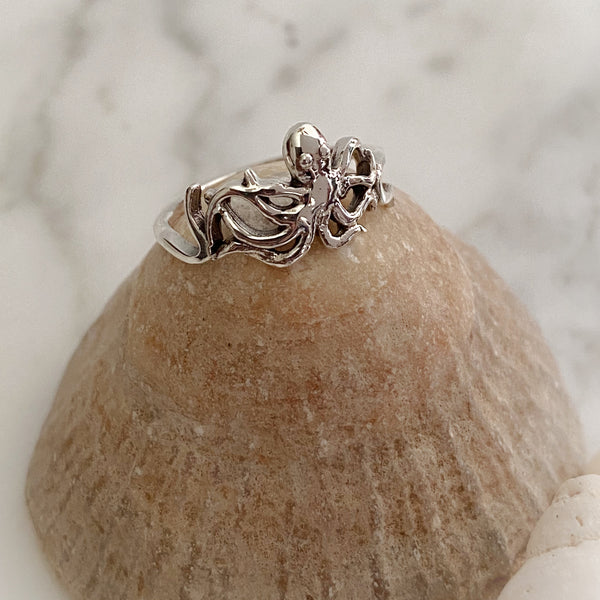Original price $ 28.00 - Original price $ 28.00Original price$ 28.00$ 28.00 - $ 28.00Current price $ 28.00| /This fun ring has an octopus with swirling tentacles. Available in whole sizes 6-9. Sterling silver. 3/8" across widest point.