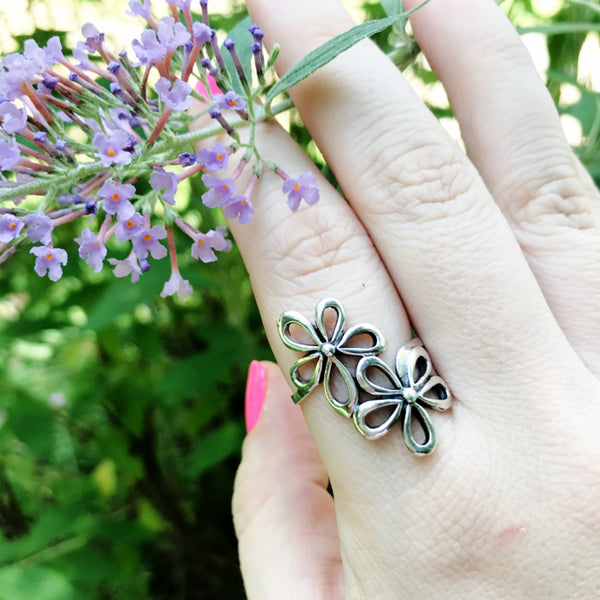 Original price $ 26.00 - Original price $ 26.00Original price$ 26.00$ 26.00 - $ 26.00Current price $ 26.00| /This statement ring is the outline of two oversize daisy flowers. Sterling silver. Available in whole sizes 7-10. Face of ring measures 1" long.