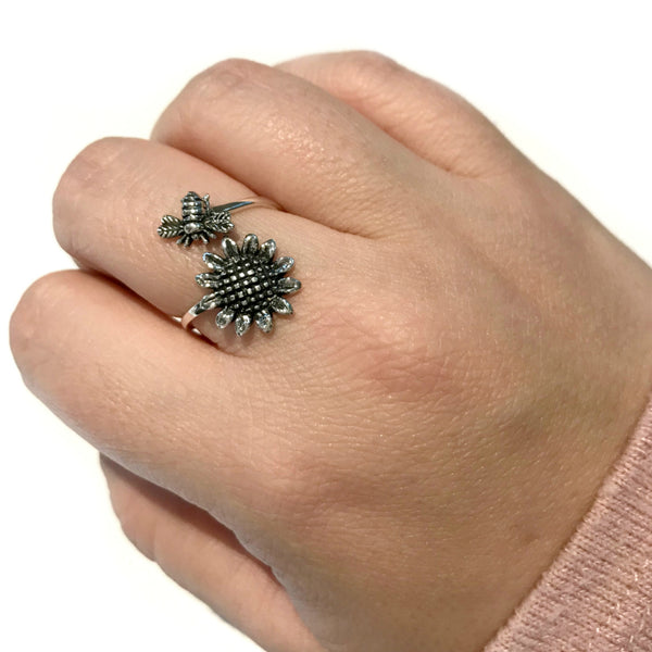 Original price $ 14.00 - Original price $ 14.00Original price$ 14.00$ 14.00 - $ 14.00Current price $ 14.00| /A sweet sunflower rests atop a simple band, with oxidization highlighting the details on the petals and center of the flower. Sterling silver. Avai...